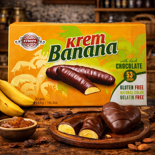 View full detailsEvropa Krem Banana is a banana-flavored foam candy coated with dark chocolate in a 544 g box.Produced in North Macedonia by Evropa Skopje, it combi...