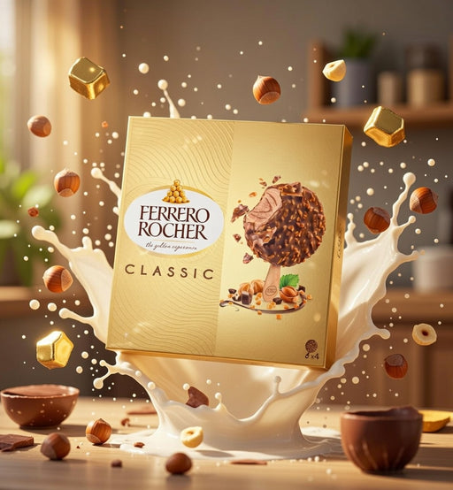 View full detailsFerrero Rocher Classic Ice Cream Sticks are a hazelnut-and-chocolate frozen treat in a 4 x 70 ml multipack. This Ferrero Rocher-branded dessert pai...