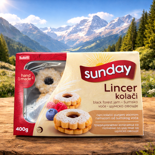 Sunday Lincer Cookies Blackforest are sandwich-style cookies filled with black forest jam in a 400g pack. Sunday is a Macedonian sweets brand with ...