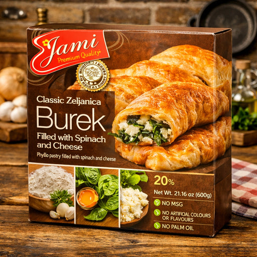 View full detailsJami Burek Classic Zeljanica Spinach and Cheese 600g is a frozen phyllo pastry filled with spinach and cheese. It comes in a 600 g box and should b...