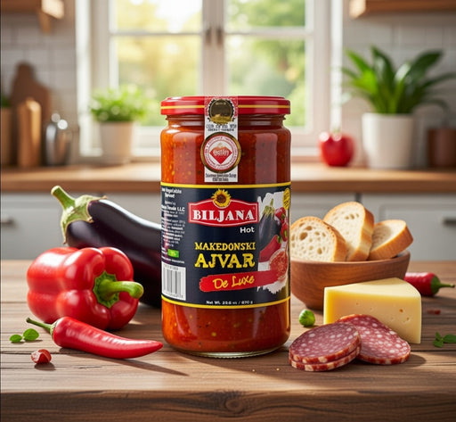 View full detailsBiljana Hot Ajvar Roasted Red Pepper & Eggplant Spread 670g is a premium European vegetable spread offered in its traditional format. Crafted w...