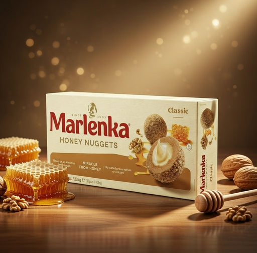 View full detailsMarlenka Honey Nuggets Classic 235 g are bite-size honey cake pieces with a creamy filling and a honey-crumb coating. Marlenka is known for honey-c...