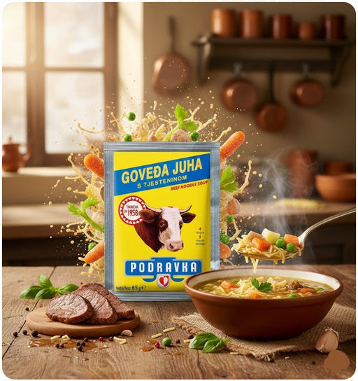 View full detailsPodravka Beef Noodle Soup Mix is a quick soup packet with short noodles in a 65 g pack.From Croatian brand Podravka, it’s designed to deliver a com...