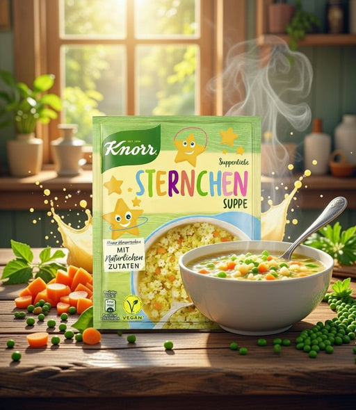 View full detailsKnorr Suppenliebe Sternchen is a star-shaped noodle soup mix in an 84 g packet that makes about 1 liter of soup. Knorr is a Unilever-owned food bra...