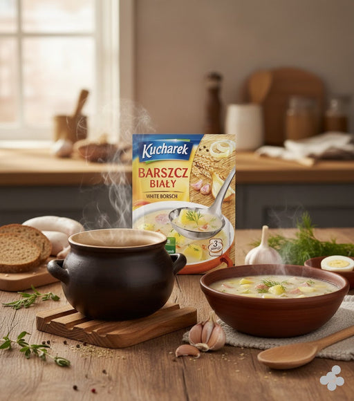 Kucharek White Borscht Soup Mix is a seasoning base for traditional white borscht in a 40 g pouch. Kucharek is the brand on the package for this so...